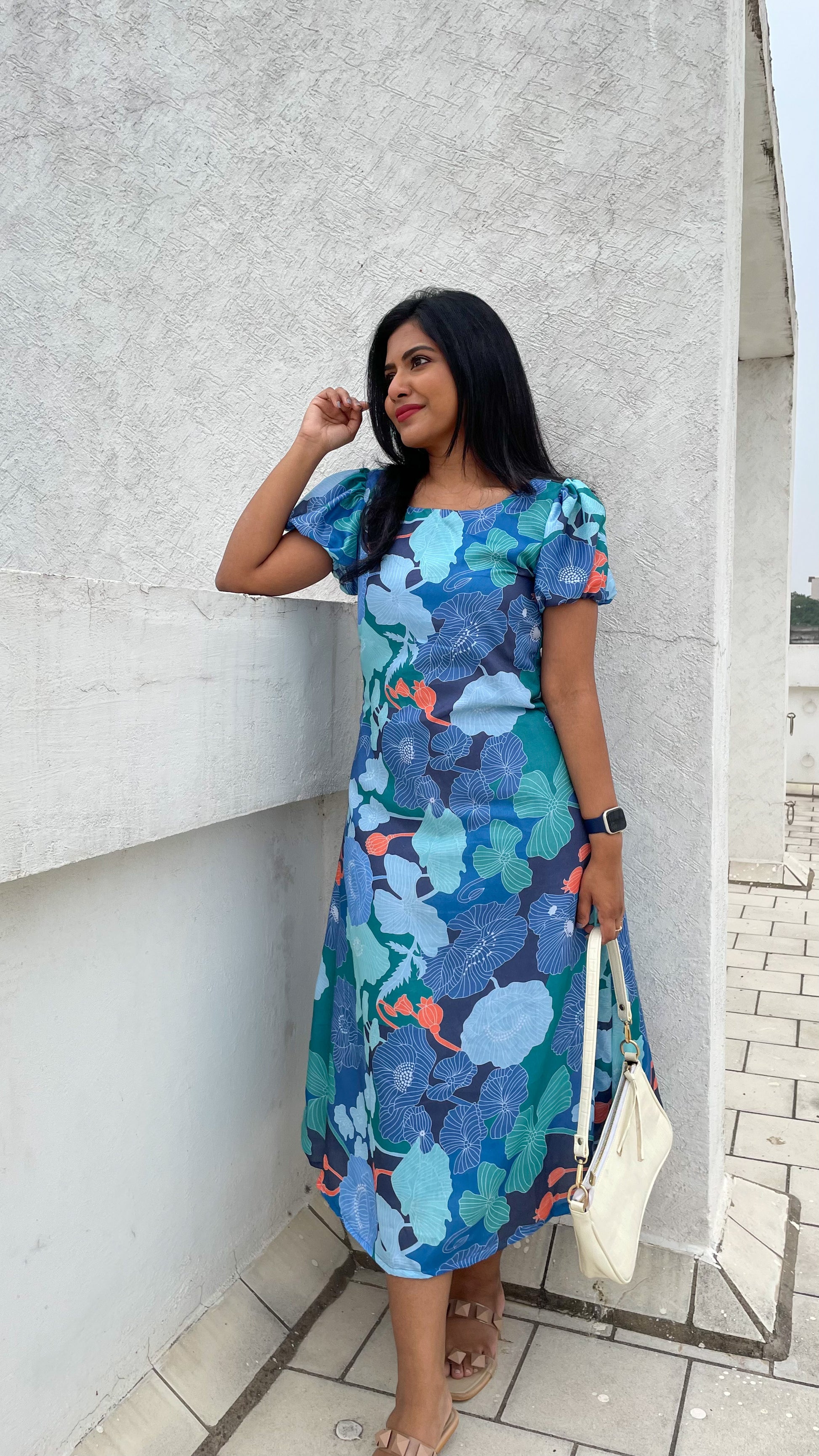 A-Line Muslin dress with puff sleeve detailing perfect for brunch, vacay look! This different shades of blue in the outfit is a must have in your wardrobe.